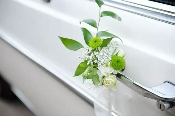 车门装饰起来比较容易,因为车把很好固定装饰物。车门的装饰可以是捆绑式的装饰物,也可以粘连在车门上,一般会用鲜花、拉花、丝带等装饰。